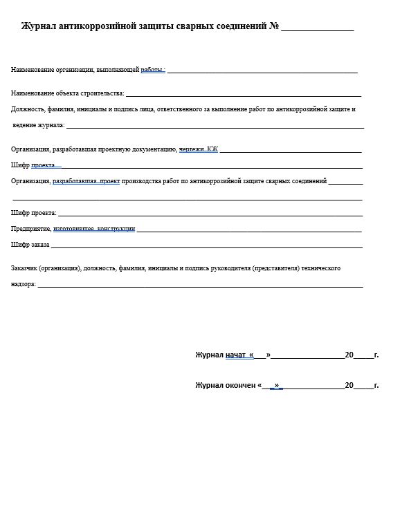 Этот журнал предназначен для учета антикоррозийной защиты сварных соединений. Это позволяет систематизировать информацию и легко находить нужные данные. Журнал антикоррозийной защиты сварных соединений является важным инструментом для контроля качества и обеспечения долговечности конструкций. Он помогает отслеживать состояние сварных соединений и своевременно принимать меры по их защите от коррозии. Этот журнал станет незаменимым помощником для специалистов, занимающихся антикоррозийной защитой сварных соединений. Он позволит им эффективно управлять процессом защиты и обеспечивать надежность конструкций.