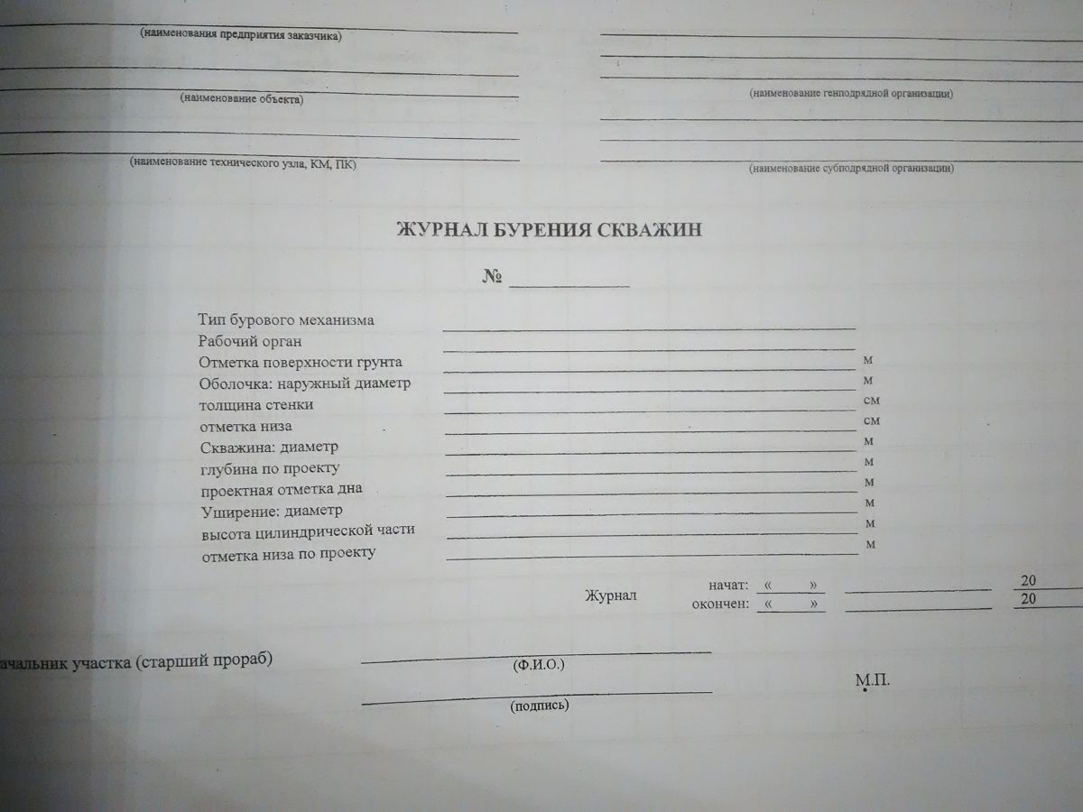 Этот журнал бурения скважин станет незаменимым помощником для специалистов, работающих в сфере геологоразведки и строительства. Он предназначен для записи всех необходимых данных, связанных с процессом бурения, таких как глубина скважины, тип грунта, используемое оборудование и другие важные параметры. . Он поможет вам вести учет всех этапов бурения и оперативно реагировать на возникающие проблемы. Этот журнал станет надежным спутником в вашей работе и поможет вам достичь высоких результатов.