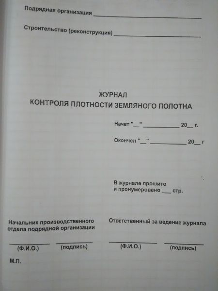 Этот журнал предназначен для контроля плотности земляного полотна. Он является важным инструментом для обеспечения качества строительных работ. В журнале фиксируются данные о плотности грунта, что позволяет контролировать процесс уплотнения и предотвращать возможные дефекты. . Внутри находятся чистые листы, на которых можно записывать все необходимые данные. Удобный формат позволяет легко переносить журнал на стройплощадку и использовать его в полевых условиях. Этот журнал станет незаменимым помощником для инженеров и строителей, которые занимаются контролем качества земляных работ. С его помощью можно обеспечить соответствие работ установленным нормам и стандартам.