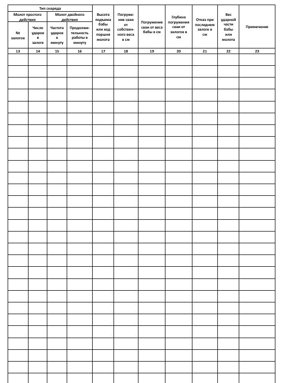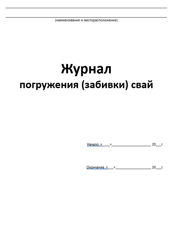 Журнал погружения (забивки) свай — важный документ, фиксирующий процесс установки железобетонных или металлических свай в грунт. Это официальный отчетный бланк, предназначенный для учета всех операций, связанных с монтажом свайных конструкций. Журнал используется для регистрации глубины забивки каждой отдельной сваи, диаметра ствола, марки материала, даты проведения работ и прочих технических характеристик.