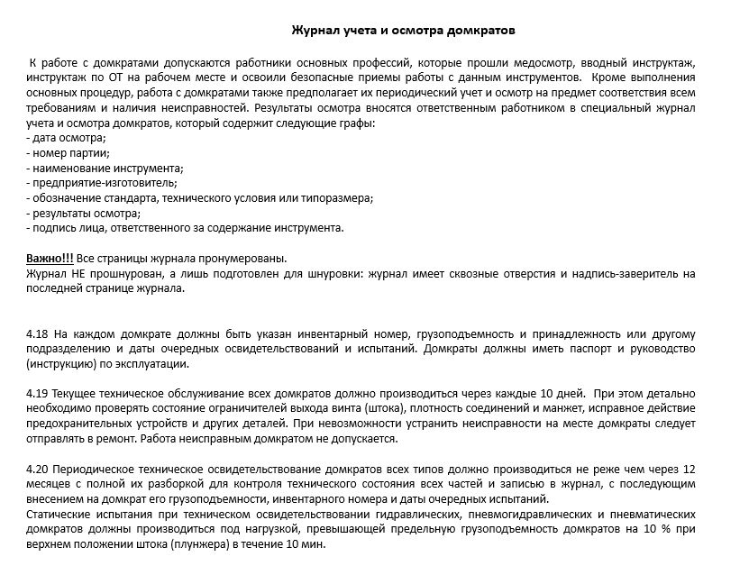 Журнал учета и осмотра домкратов — это важный документ, который необходим для обеспечения безопасности при использовании домкратов. В нем фиксируются все данные о домкратах, включая их тип, модель, серийный номер, дату изготовления и дату последнего осмотра. Также в журнале указываются результаты осмотра, включая наличие дефектов и неисправностей, а также рекомендации по их устранению.