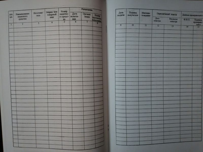 На обложке журнала указано его название и назначение. Внутри содержатся страницы для записей, которые позволяют систематизировать информацию о средствах защиты. В журнале можно найти данные о типе, количестве, дате проверки и сроке службы каждого средства защиты.