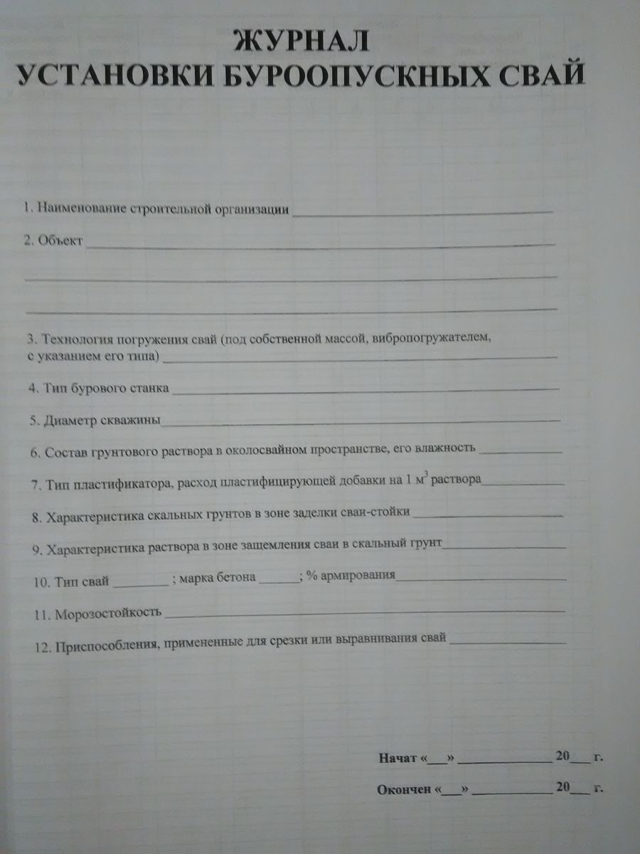 Этот журнал предназначен для учета и контроля процесса установки буроопускных свай. Журнал содержит поля для записи замечаний и комментариев, что позволяет оперативно реагировать на возникающие проблемы и корректировать процесс. В конце журнала предусмотрены страницы для итоговых данных и анализа результатов работ. Такой журнал является важным инструментом для обеспечения качества и безопасности строительных работ, а также для контроля за соблюдением технологии установки свай. Он поможет вам организовать работу на объекте и обеспечит прозрачность процесса для всех участников строительства.