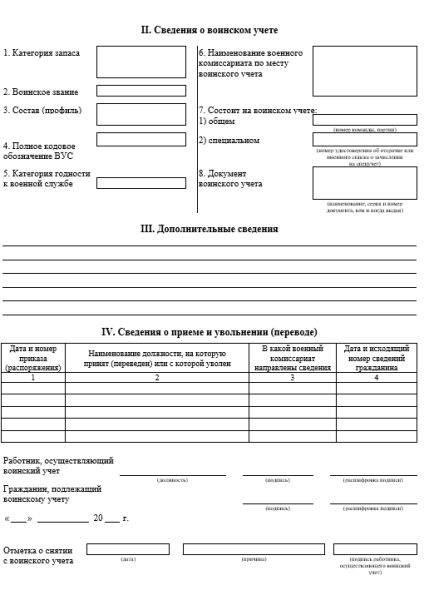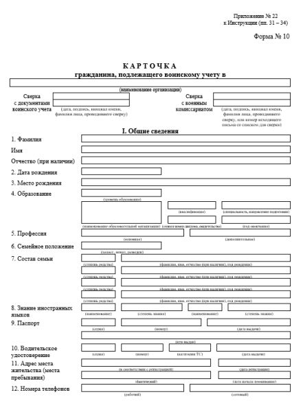 Карточка воинского учета формы 10 — это важный документ, который необходим для учета военнообязанных граждан. Она содержит информацию о личности, образовании, семейном положении, а также данные о воинском учете. В карточке указываются сведения о прохождении военной службы, категория годности к военной службе, наличие отсрочки или освобождения от призыва. Также в ней фиксируются данные о прохождении медицинских осмотров и результатах тестирования на наркотики. Карточка воинского учета формы 10 является обязательным документом для всех военнообязанных граждан и должна быть заполнена корректно и своевременно. Она хранится в личном деле гражданина и используется для ведения учета в военкоматах. В случае изменения каких-либо данных, указанных в карточке, необходимо своевременно уведомить военкомат и внести соответствующие изменения. Карточка воинского учета формы 10 является важным документом, который помогает обеспечить учет и контроль за военнообязанными гражданами.