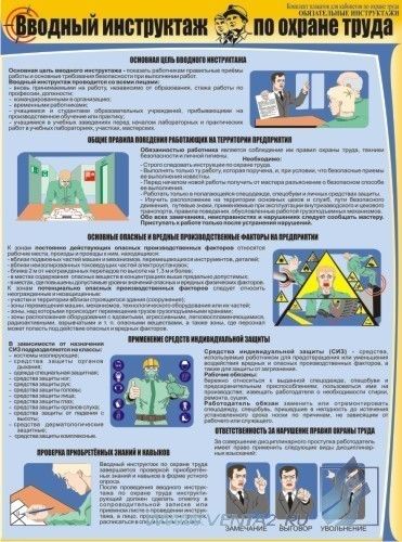 Этот плакат представляет собой набор обязательных инструктажей, включающий вводный инструктаж и вводный противопожарный инструктаж. Он выполнен в формате А2 и содержит три листа информации. Плакат предназначен для использования в образовательных учреждениях, на предприятиях и в других организациях, где требуется проведение инструктажей по технике безопасности и пожарной безопасности. На плакате представлены наглядные иллюстрации и текстовые материалы, которые помогут сотрудникам и учащимся быстро и эффективно усвоить необходимую информацию. Вводный инструктаж охватывает основные правила поведения на рабочем месте, меры предосторожности и действия в случае возникновения чрезвычайных ситуаций. Вводный противопожарный инструктаж содержит информацию о правилах пожарной безопасности, действиях при пожаре и использовании средств пожаротушения. Плакат выполнен в ярких цветах, что делает его привлекательным и легко читаемым. Он может быть размещен в учебных классах, на рабочих местах или в других местах, где сотрудники и учащиеся могут ознакомиться с информацией. Этот плакат является важным инструментом для обеспечения безопасности на рабочем месте и в учебных заведениях. Он поможет сотрудникам и учащимся быть готовыми к любым чрезвычайным ситуациям и действовать правильно в случае их возникновения.