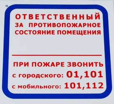 Знак пожарной безопасности F16 "Ответственный за противопожарное состояние помещения / При пожаре звонить 01, 101, 112" представляет собой наклейку размером 200х200 мм, изготовленную на ПВХ пленке в соответствии с требованиями ГОСТ 12.4.026-2015. Данный знак имеет логотип производителя S (Стандарт), что подтверждает его высокое качество и соответствие установленным стандартам безопасности. Наклейка "Ответственный за пожарную безопасность", предназначена для информирования об ответственном лице за противопожарное состояние помещения и пожарную безопасность, размещается на видимых местах, таких как двери и стены помещений. Она обеспечивает доступность информации о том, к кому можно обратиться в случае возникновения чрезвычайной ситуации, а также номера телефонов для вызова экстренных служб: 01 (пожарная служба), 101 (пожарная служба в России), 112 (единый номер экстренных служб). Знак "Ответственный за противопожарное состояние помещения" предназначен для приклеивания на гладкую, ровную поверхность, которая предварительно должна быть очищена от загрязнений, что гарантирует надежное крепление и долговечность использования наклейки в условиях эксплуатации. Гарантийный срок данного изделия составляет 5 лет, что соответствует требованиям ГОСТ 12.4.026-2015, обеспечивая надежность и долговечность наклейки. Установка знака F16 "Ответственный за противопожарное состояние помещения / При пожаре звонить 01, 101, 112" является важным шагом в обеспечении безопасности и быстрого реагирования в случае возникновения пожара.