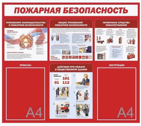 Стенд «Пожарная безопасность» — это наглядное средство обеспечения противопожарной безопасности в учреждениях различного профиля. Стенд содержит важную информацию по действиям при пожаре, мерам профилактики, использованию первичных средств пожаротушения и требованиям законодательства. Характеристики: Размер стенда: 750×650 мм Материал: ПВХ пластик 3 мм — прочный, лёгкий, влагостойкий Печать: УФ-печать — изображение яркое, не выцветает Карманы: 2 прозрачных кармана формата A4 — для размещения инструкций, приказов и нормативных документов Монтаж: двусторонняя клейкая лента на задней стороне — установка без сверления